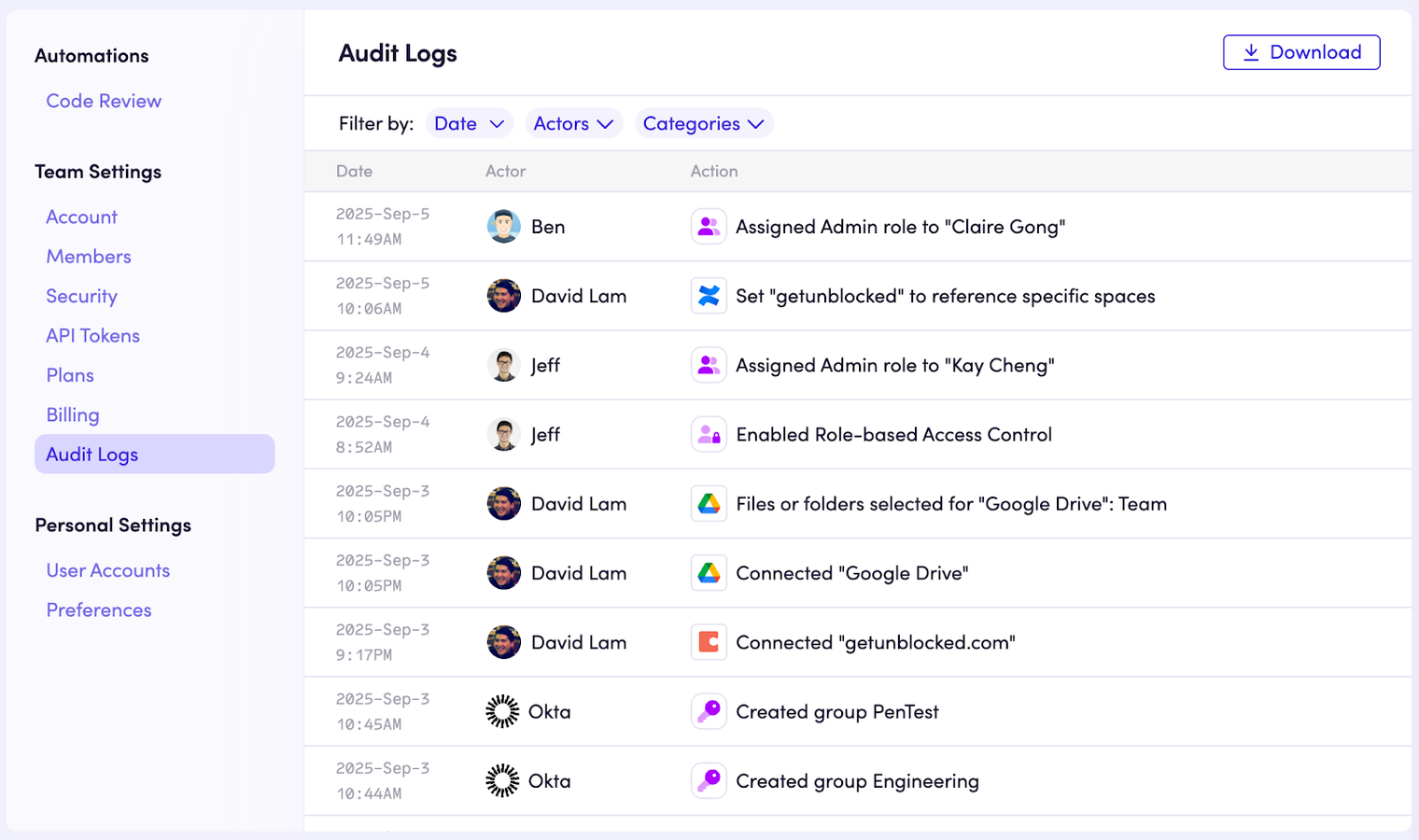 When Unblocked is plugged into your CI, your data sources, and your workflows, you want to know what’s happening behind the scenes. Audit logs give you that clarity.