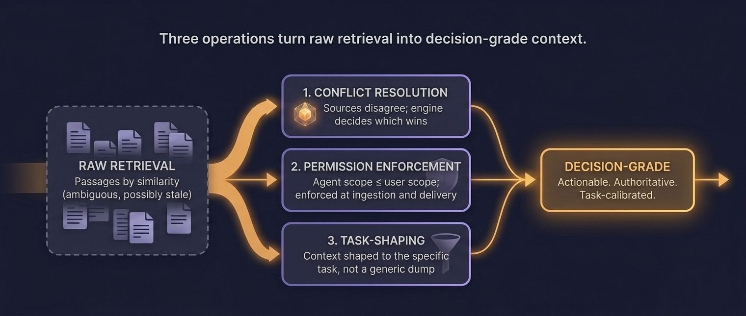 Three operations that retrieval systems do not perform: conflict resolution, permission enforcement, and task-shaping. All three are specific and measurable. Absence of any one of them means the context is not decision-grade regardless of how good the retrieval is.