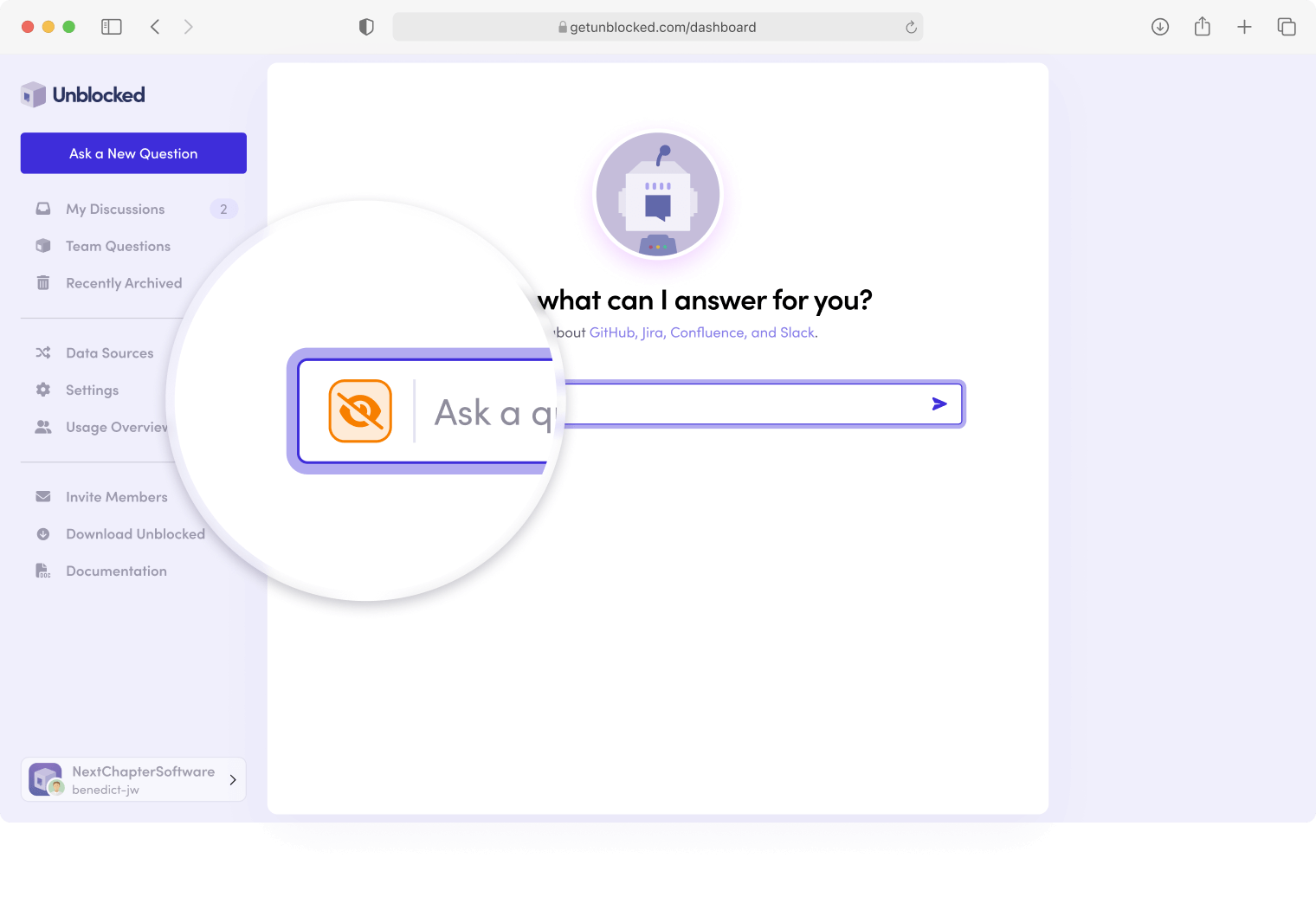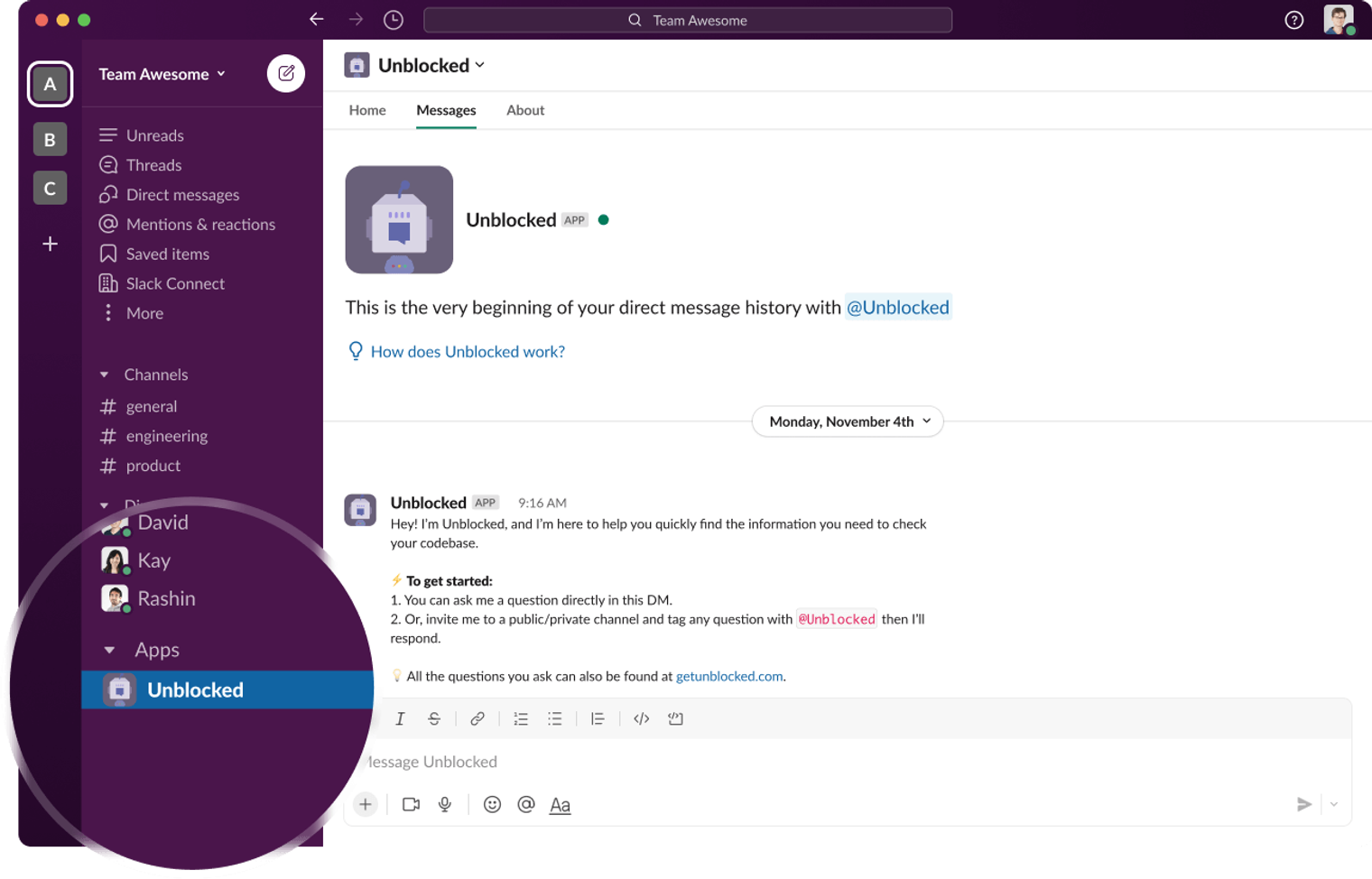 To avoid noise, use Incognito Mode in Slack by DMing your question to the Unblocked bot. You can find Unblocked by searching for “Unblocked” in your DMs. Like other Slack conversations, you can ask as many follow-up questions as you need right in your DM.