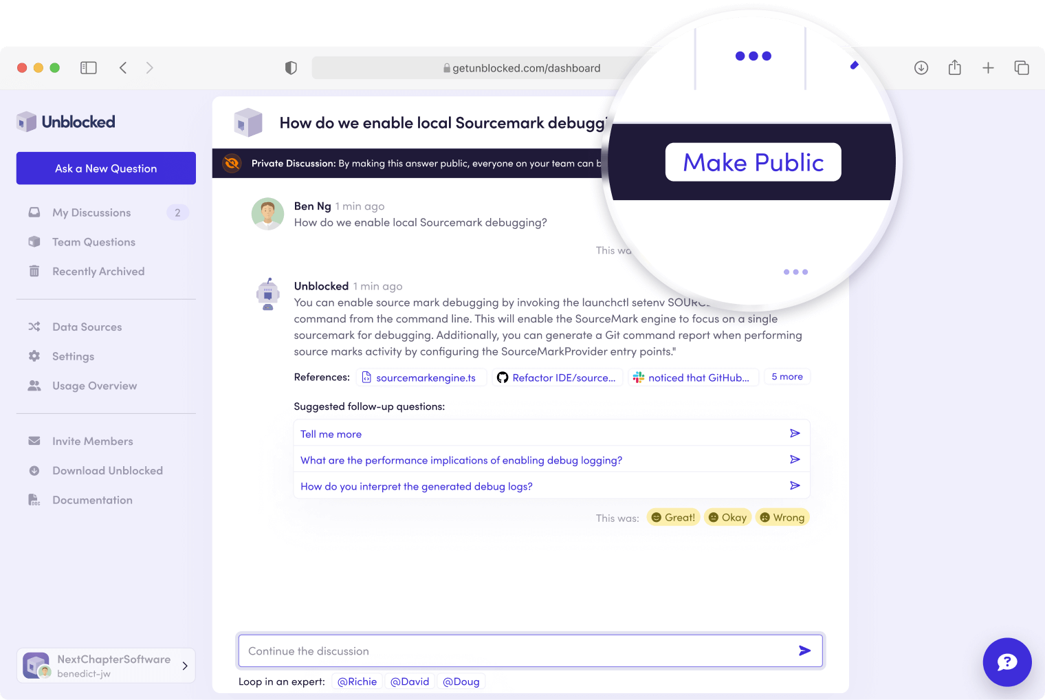 When you ask a public question to Unblocked, it contributes back to the Unblocked knowledge base for your team.