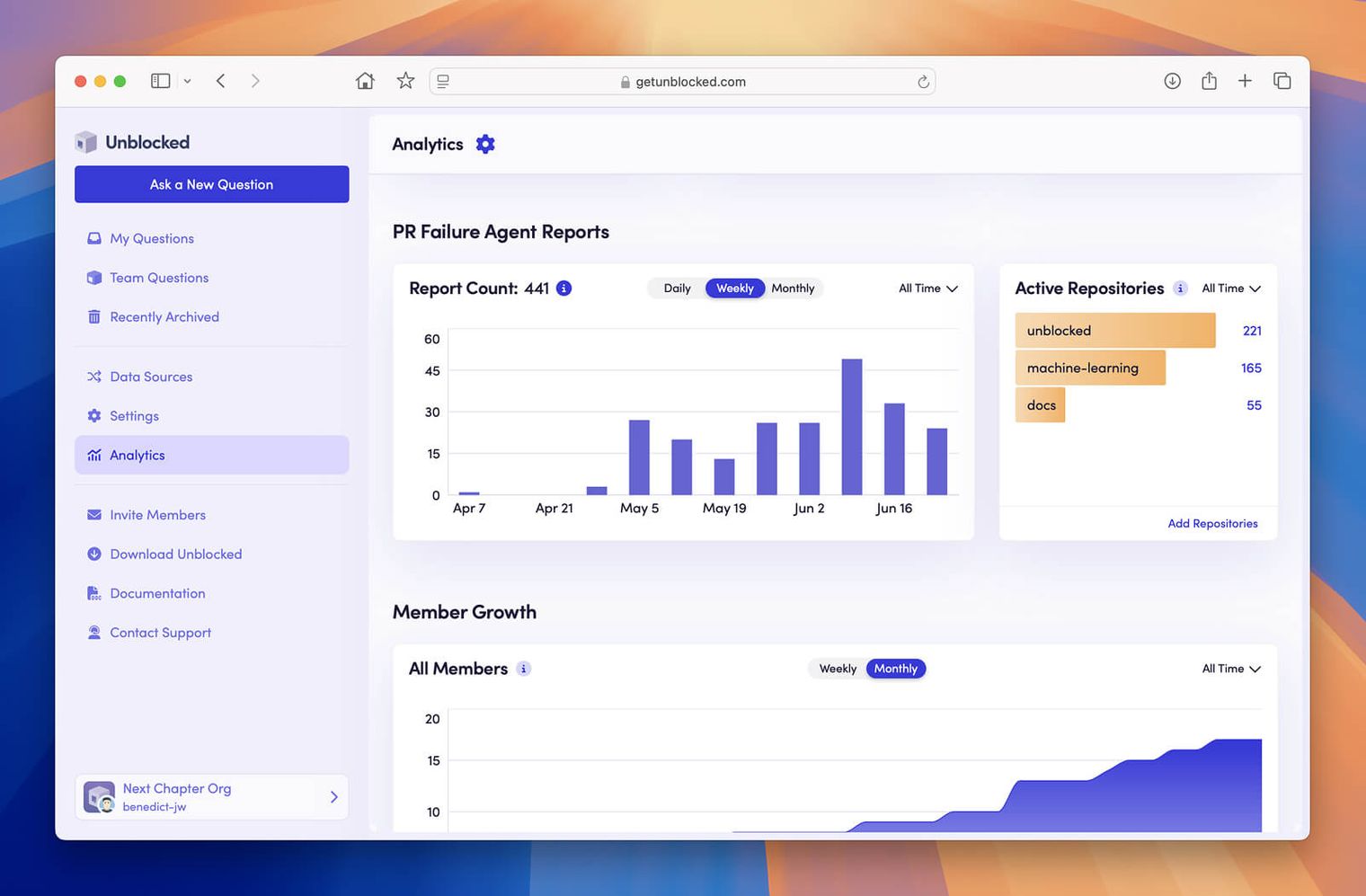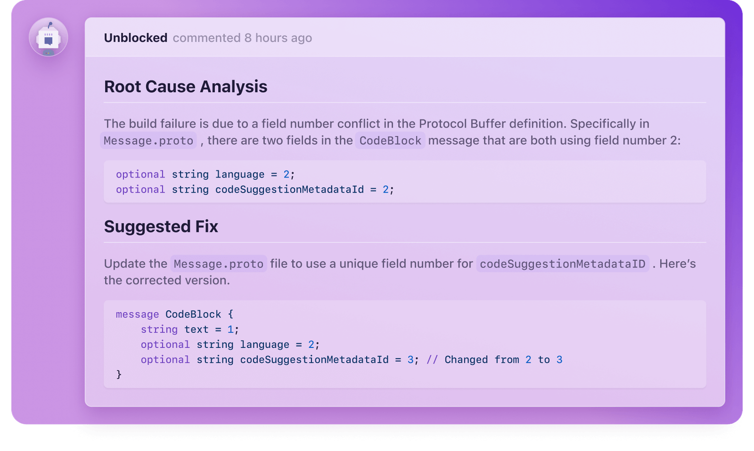When your CI checks fail, Unblocked will automatically analyze the failure, determine the root cause, and provide clear, actionable feedback directly within your pull request. No more digging through lengthy logs or deciphering cryptic error messages. The PR Failure Agent will tell you exactly what went wrong and how to fix it.