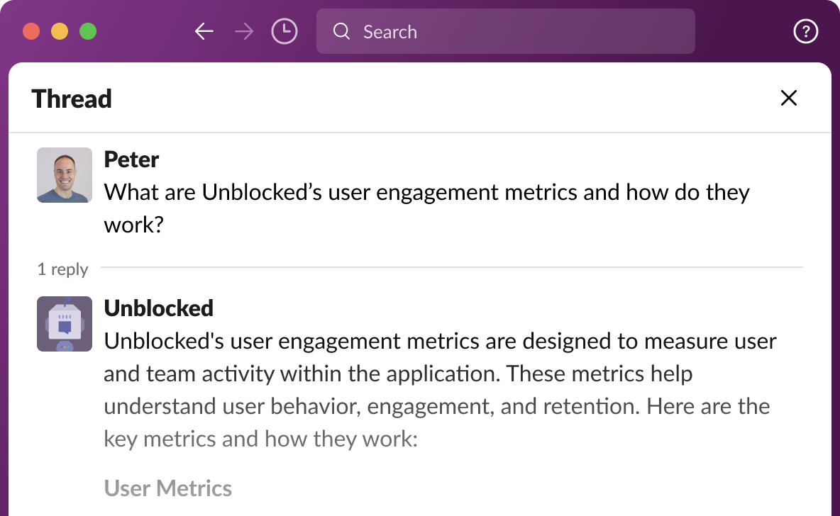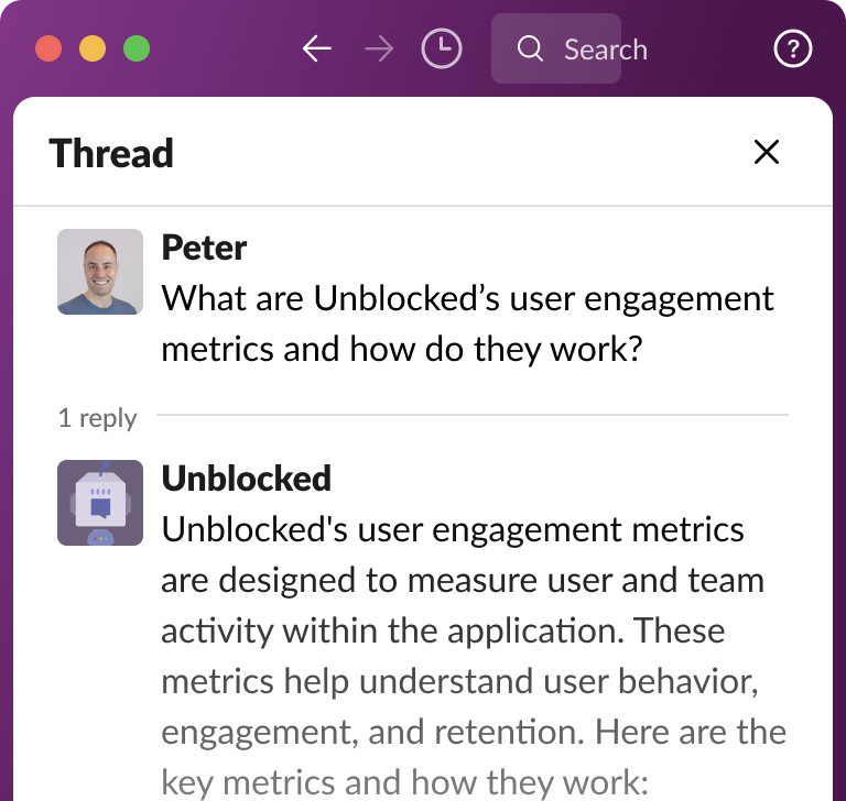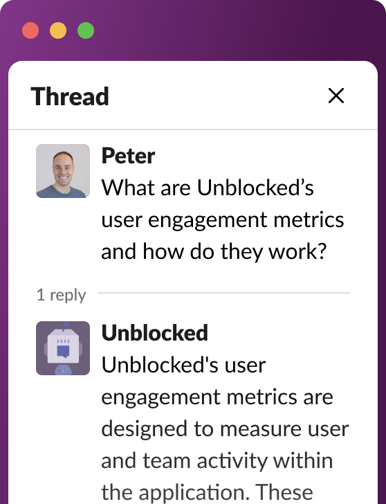 Ask a question in any channel and get a cited answer in seconds. Unblocked can respond automatically when it detects questions it can answer.